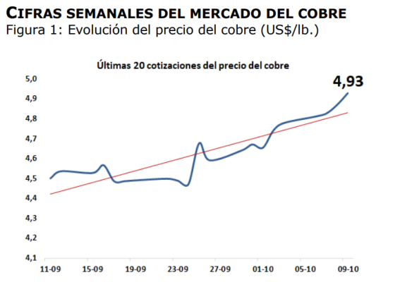 El precio del cobre alcanzó este jueves su nivel histórico más alto, con $4,93 dólares la libra. La cifra supera al récord anterior, registrado el 20 de mayo de 2024, de $4,925 dólares por libra. Esto representa una variación de 25% respecto de inicios del presente año. A la fecha el precio promedio se sitúa … Sigue leyendo Informe del Mercado Internacional del Cobre, semana del 6 a 9 de octubre de 2025